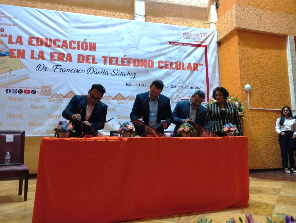 Toluca, Estado de México. En un emotivo acto que combinó la reflexión académica con el orgullo sindical, el secretario general de la Sección 17 del SNTE en el Valle de Toluca, José Alfredo Geraldo Benoit, encabezó la entrega del libro “La educación en la era del teléfono celular”, obra del doctor Francisco Dávila Sánchez, editada por el Fondo Editorial del Magisterio.