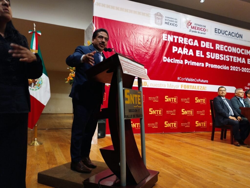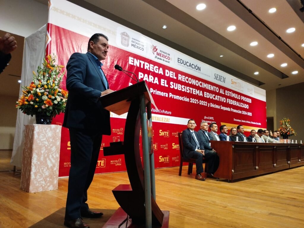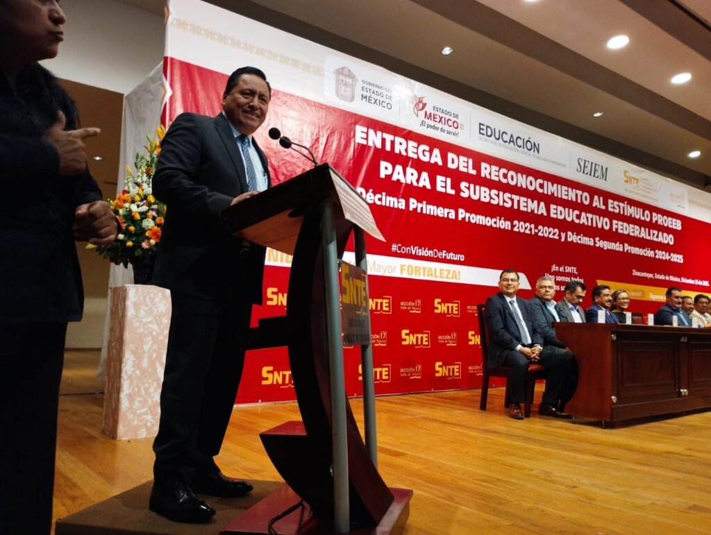 “El magisterio mexiquense no es espectador de la transformación educativa; es protagonista”, afirmó el dirigente sindical, al resaltar que cada estímulo simboliza una trayectoria profesional construida con disciplina, constancia, liderazgo pedagógico y un profundo sentido social; además, dijo que reconocer al magisterio fortalece la educación pública y brinda certeza laboral a quienes dedican su vida a la formación de niñas, niños y jóvenes.