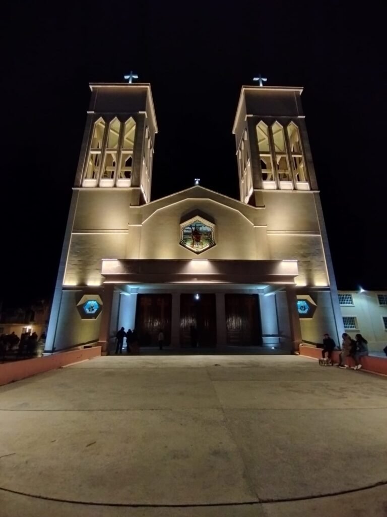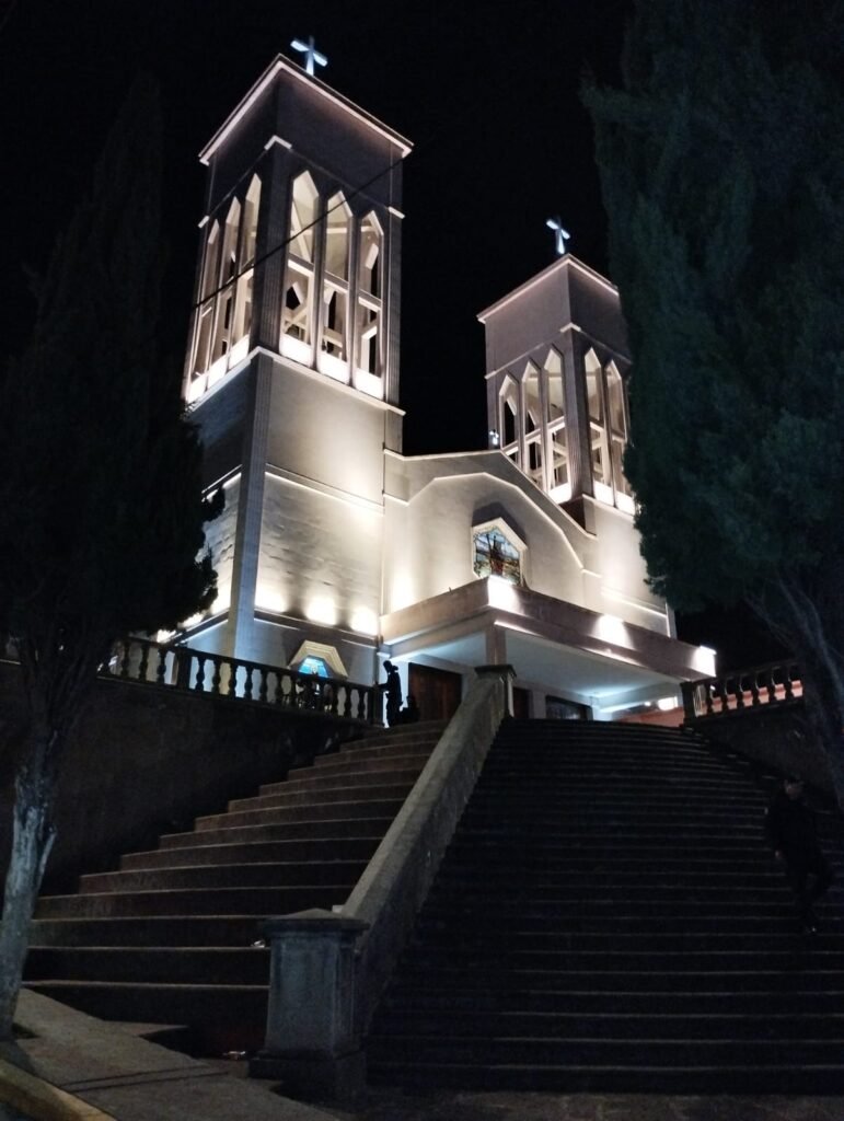 La renovada iluminación realza la majestuosidad del templo, cuya construcción comenzó en 1966 y concluyó en 1990; de estilo moderno con composición gótica, recibió su revestimiento de cantera en 2010 y este 2025 suma un sistema lumínico que resalta cada detalle de su fachada y torres.