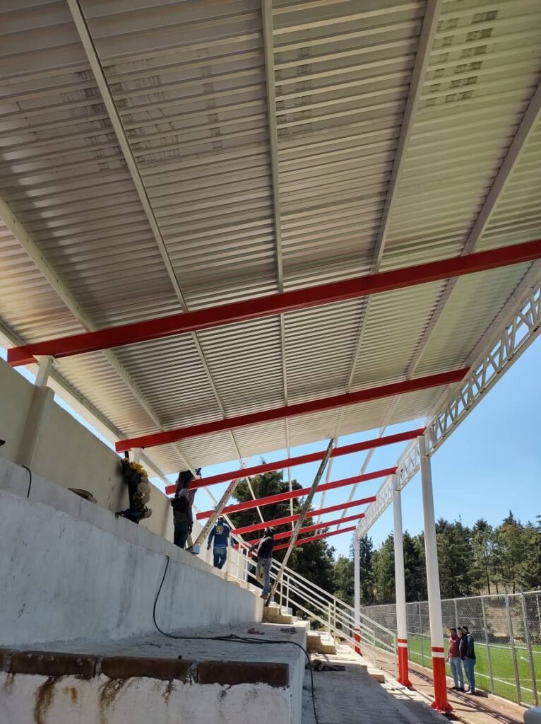 *Avanza la construcción de la techumbre en el campo de fútbol de la comunidad.
